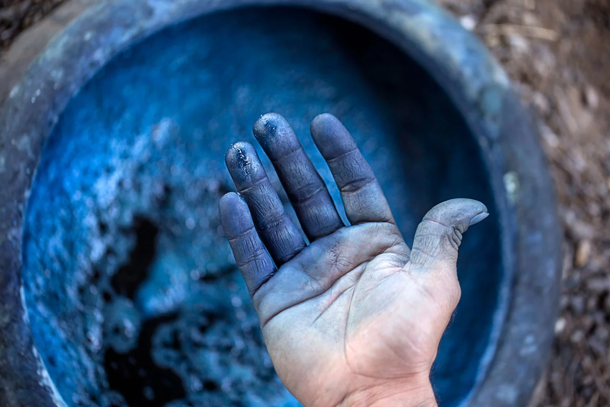 The process starts when the pot is filled with water and the various Ingredients added - lime, dates, overnight soaked Indigo. These ingredients vary depending on the geography. For example, there are certain cultures which use pineapples instead of dates. This pot is then left for 15 -20 days, post which the indigo starts leaving its colour in the water to make it yellowish green. Till this happens, water remains to be blue. Once the fabric or yarn is dyed in this yellowish green water, it is kept for drying and slowly turns blue with exposure to oxygen. After one round of dyeing, the vat has to remain idle for a few hours for the indigo to become soluble again and to leave its colour in the water for dyeing.