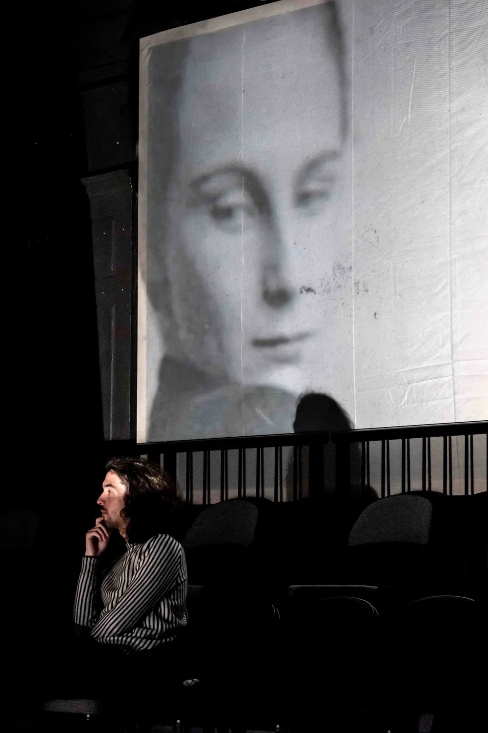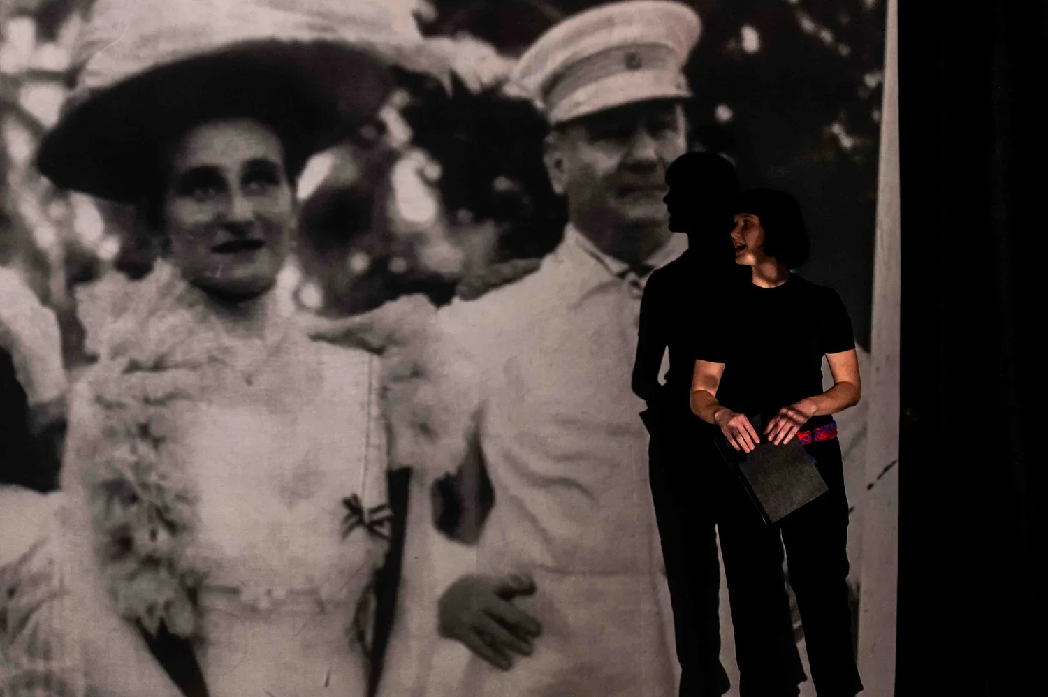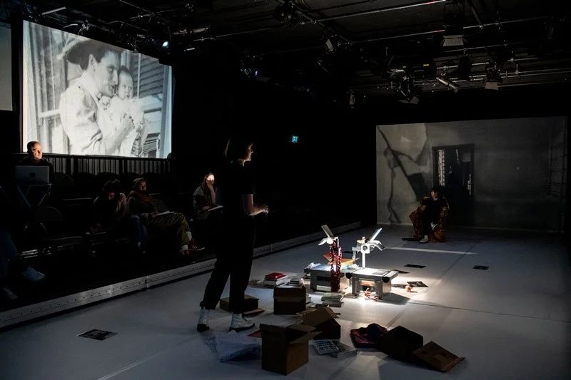 Moments from rehearsal at Theatre Neumarkt, Zurich.Blending archival fragments from the early 1900s with photography, video, and sound from our fieldwork, we created a layered narrative of testimonies and traces of environmental and socio-political change, interwoven with Nele’s lecture performance.